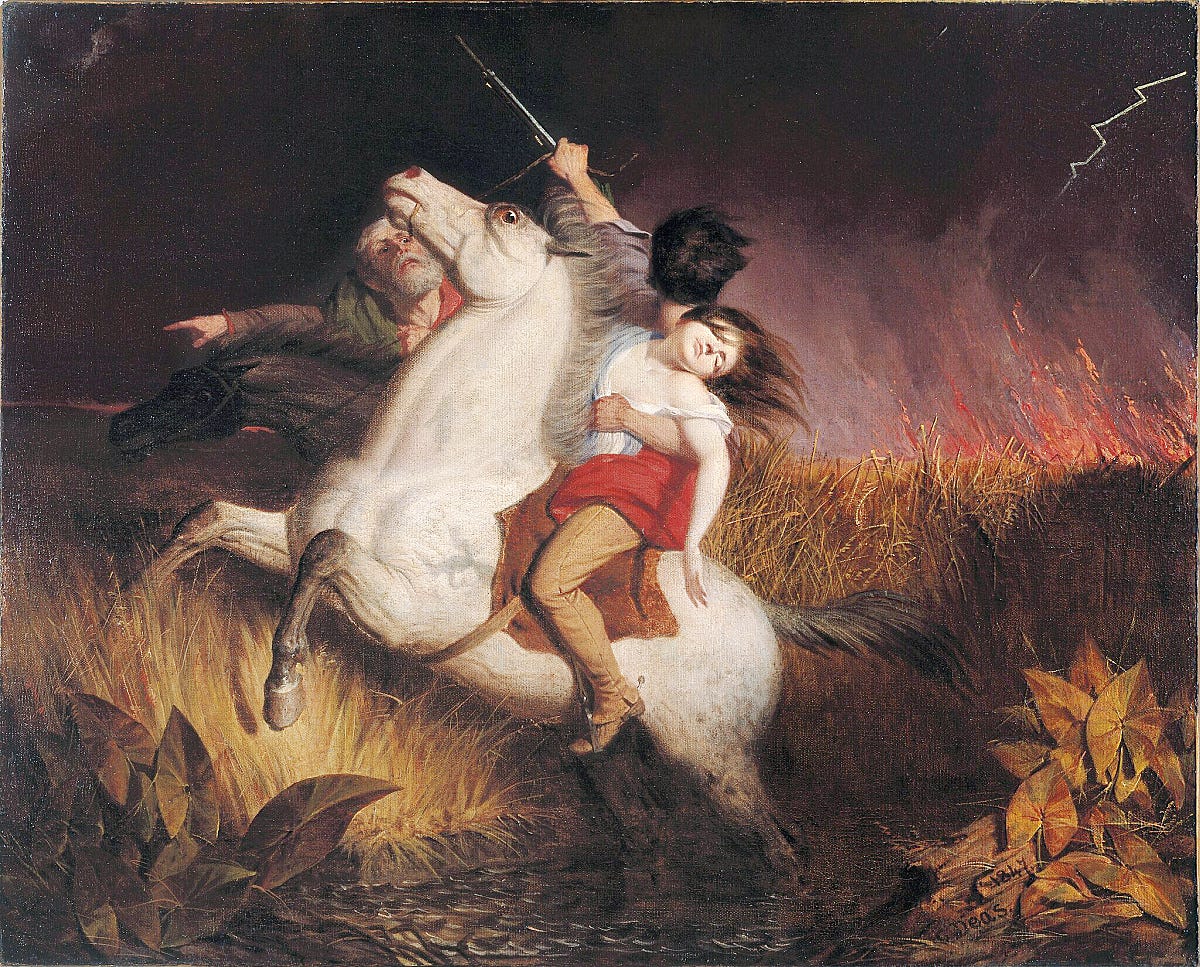 Charles Deas was an American artist, born in Pennsylvania. In 1847, he painted a piece of art called Prairie on Fire. It’s a man, rescuing a little girl from a world on fire. The horse is spooked, eyes wild as they flee the flames. Omg, people loved it.