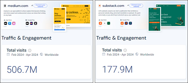In the last 3 months, 506.7 million visits to Medium and 177.9 million to Substack. On a month to month basis, Medium gets almost triple the traffic Substack gets.